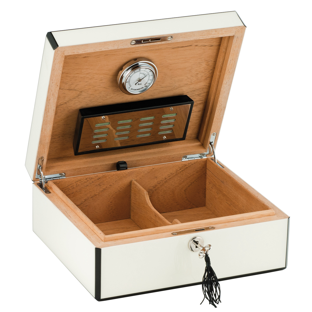 Coffret 50 cigares. Laqué blanc. Fermeture à clef. Liseré noir.