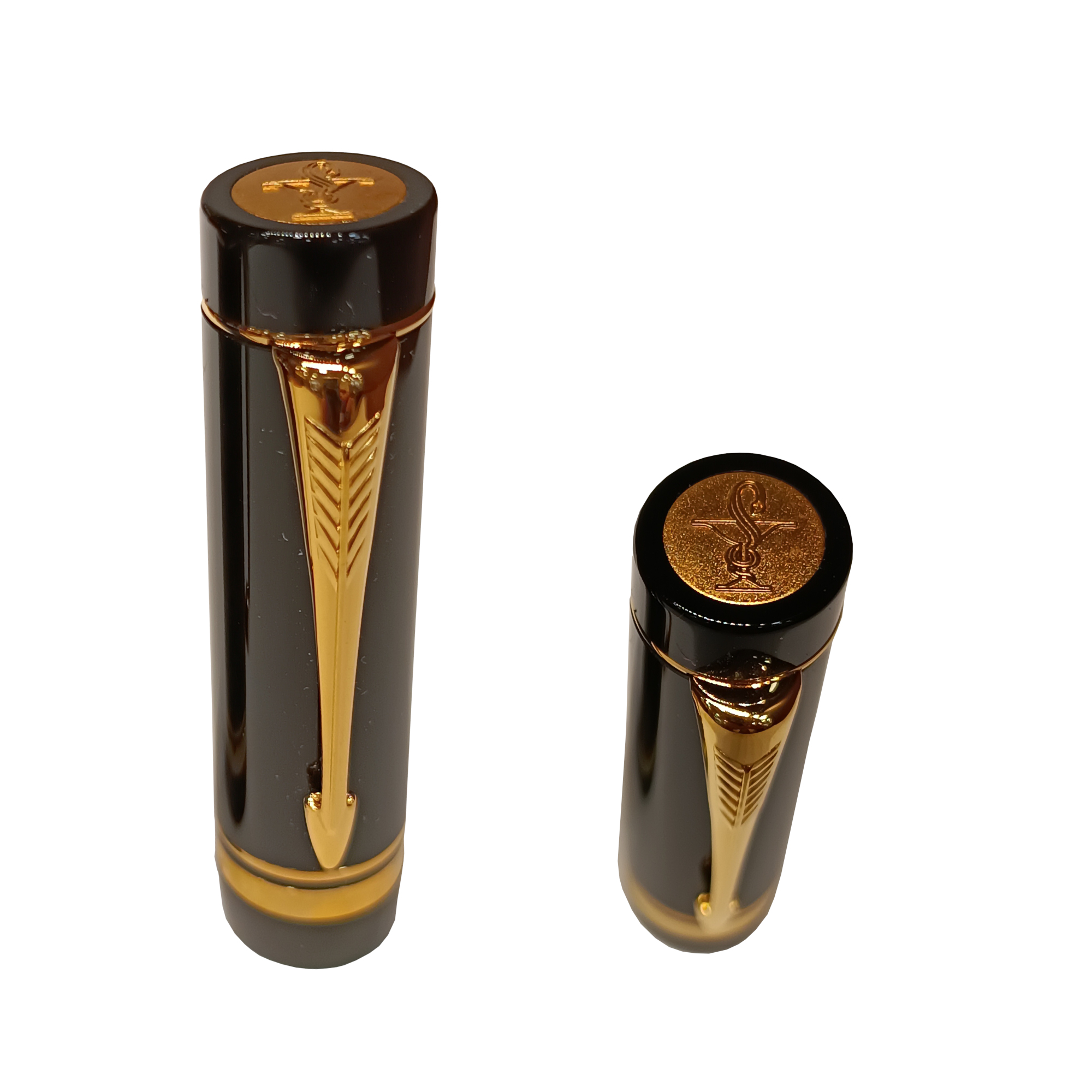 Capuchon pour stylo plume Duofold ancienne génération. Résine noire, attributs plaqués or. Pastille "Pharmacien" sur le top. PIèce exceptionnelle et rare.