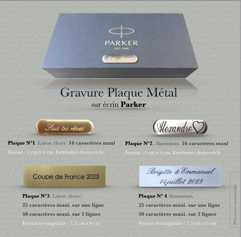 Cette offre s'adresse à tous ceux qui souhaitent personnaliser un cadeau et laisser une trace dans le temps d'une attention particulière. Cette option peut être un complément à la gravure d'un stylo  ou la remplacer lorsque celle-ci est impossible. Exemple : le stylo peut être personnalisé avec un prénom et la plaque de l'écrin recevoir le marquage d'une date ou d'un texte attentionné. Les caractères particuliers, comme un coeur, sont possibles; la gravure d'un logo également sur demande particulière (syll.valadier@wanadoo.fr). Plaques d'un format différent également  disponibles sous certaines conditions.