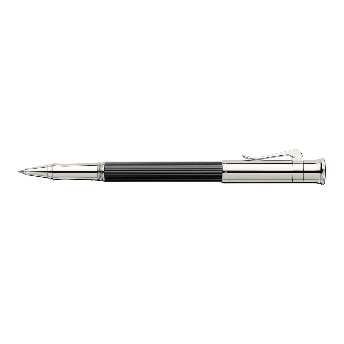 Corps en bois d'Ébène orné de fines cannelures. Bois précieux qui a été sélectionné pour son extrême dureté et sa résistance. Capuchon plaqué platine. Livré dans son écrin luxe et avec sa garantie Graf von Faber-Castell.
