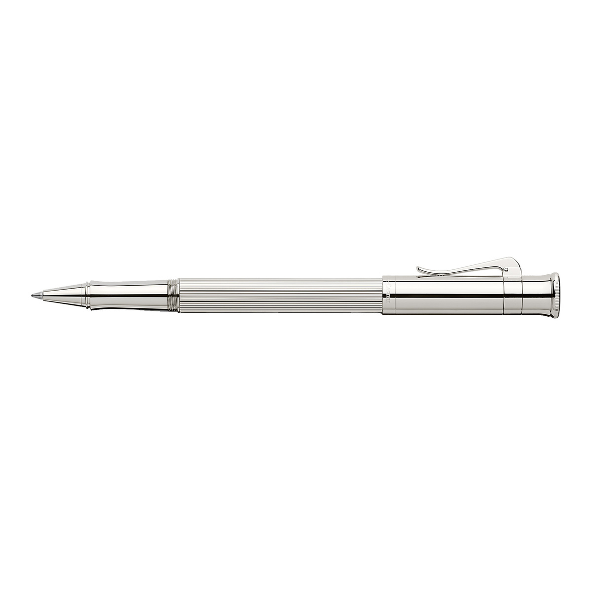 Agrafe galbée montée sur ressort. Corps et capuchon plaqués platine. Livré dans son écrin luxe et avec sa garantie Graf von Faber-Castell.
