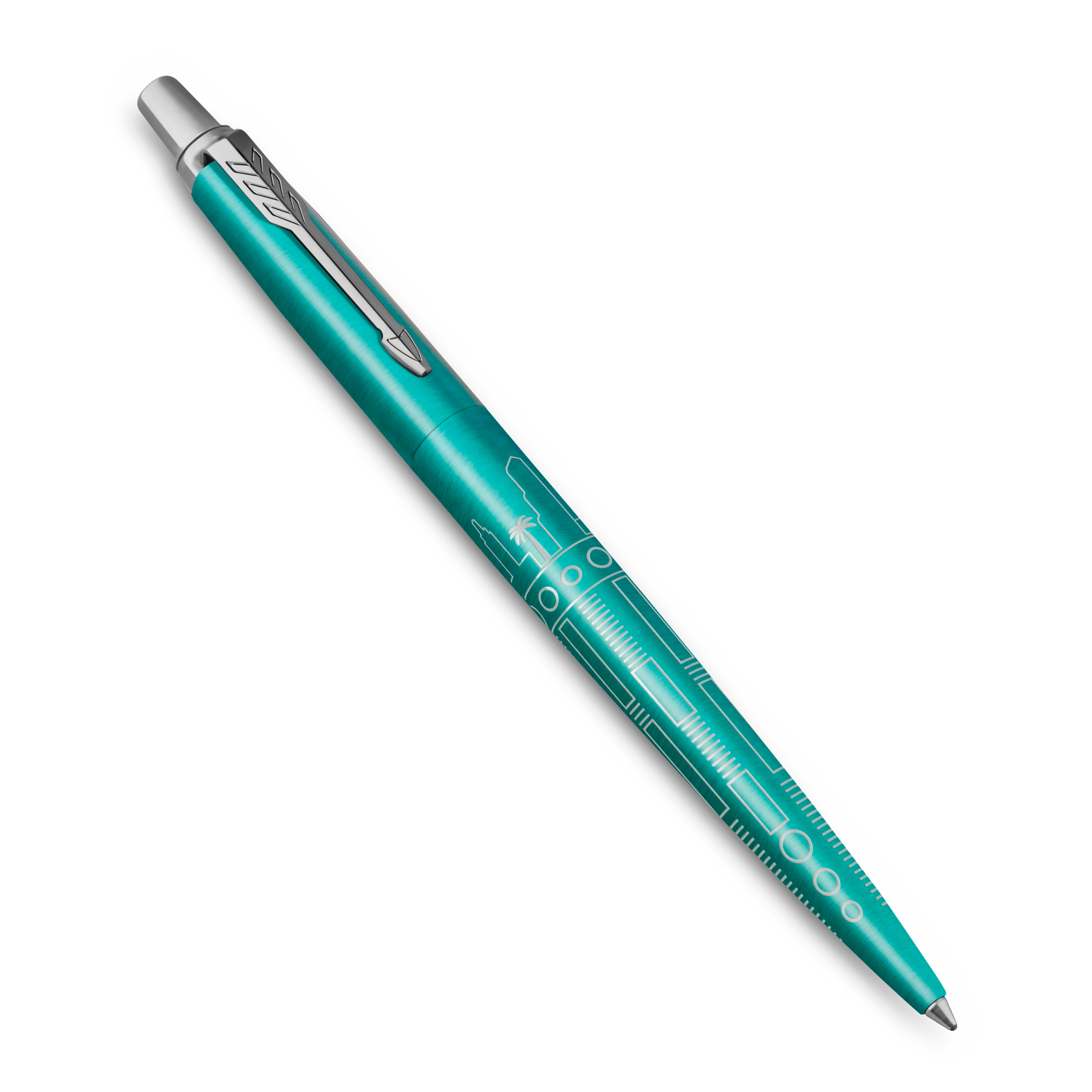 - La silhouette de la ville habilement gravée au laser et sa finition laquée turquoise témoignent du savoir-faire de Parker et confèrent au Jotter l’élégance caractéristique des stylos de luxe.