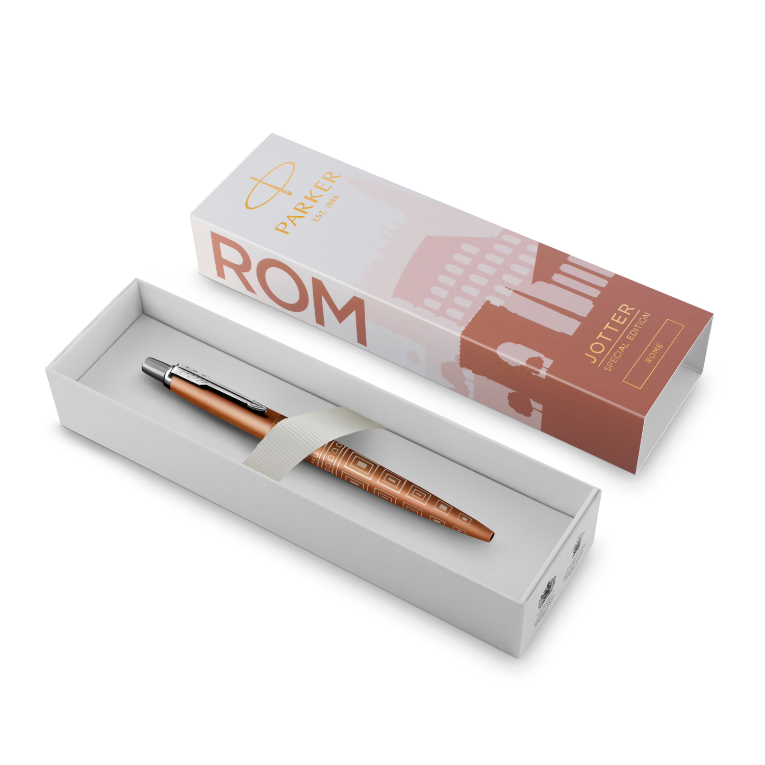Pour les jeunes adultes ouverts sur le monde, ce Jotter exclusif est à la fois un instrument d’écriture raffiné et une pièce remarquable au design emblématique et contemporain. Exemple parfait du savoir-faire PARKER, la ligne d’horizon de la ville et le motif sont gravés au laser sur le corps du stylo, tandis qu’un vernis-laque bronze satiné vient parfaire son style sophistiqué et haut de gamme. L’édition limitée fait de chacun de ces stylos de belle facture une pièce recherchée par tout collectionneur ou amateur d’instruments d’écriture, et un cadeau spécial pour une personne tout aussi spéciale. Chaque Jotter SE Rome est accompagné de son propre coffret cadeau spécialement conçu et inspiré par l’architecture ancienne de la ville. Il plaira au voyageur qui sommeille en chacun de nous.