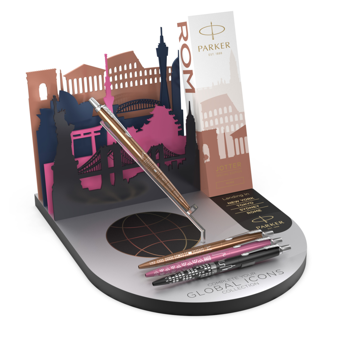 Pour un stylo apprécié dans le monde entier, il est normal que la dernière collection Jotter SE s’inspire des quatre coins du globe. La quatrième édition spéciale « Global Icons » explore quelques-uns des impressionnants joyaux architecturaux et ornements de Rome, vieux de 3 000 ans. Son design remarquable reprend un motif emblématique du dôme du Panthéon et la ligne d’horizon majestueuse de la ville des merveilles antiques. Expression du savoir-faire inimitable de PARKER, le motif est magnifiquement gravé au laser sur le corps de l’instrument d’écriture. Toile de fond parfaite pour mettre en valeur la magie historique de Rome, la finition laquée bronze satiné offre une expérience d’écriture confortable. Pour tous ceux qui ont le goût du voyage, le stylo bille Jotter SE Rome sera un guide fidèle à travers le monde.