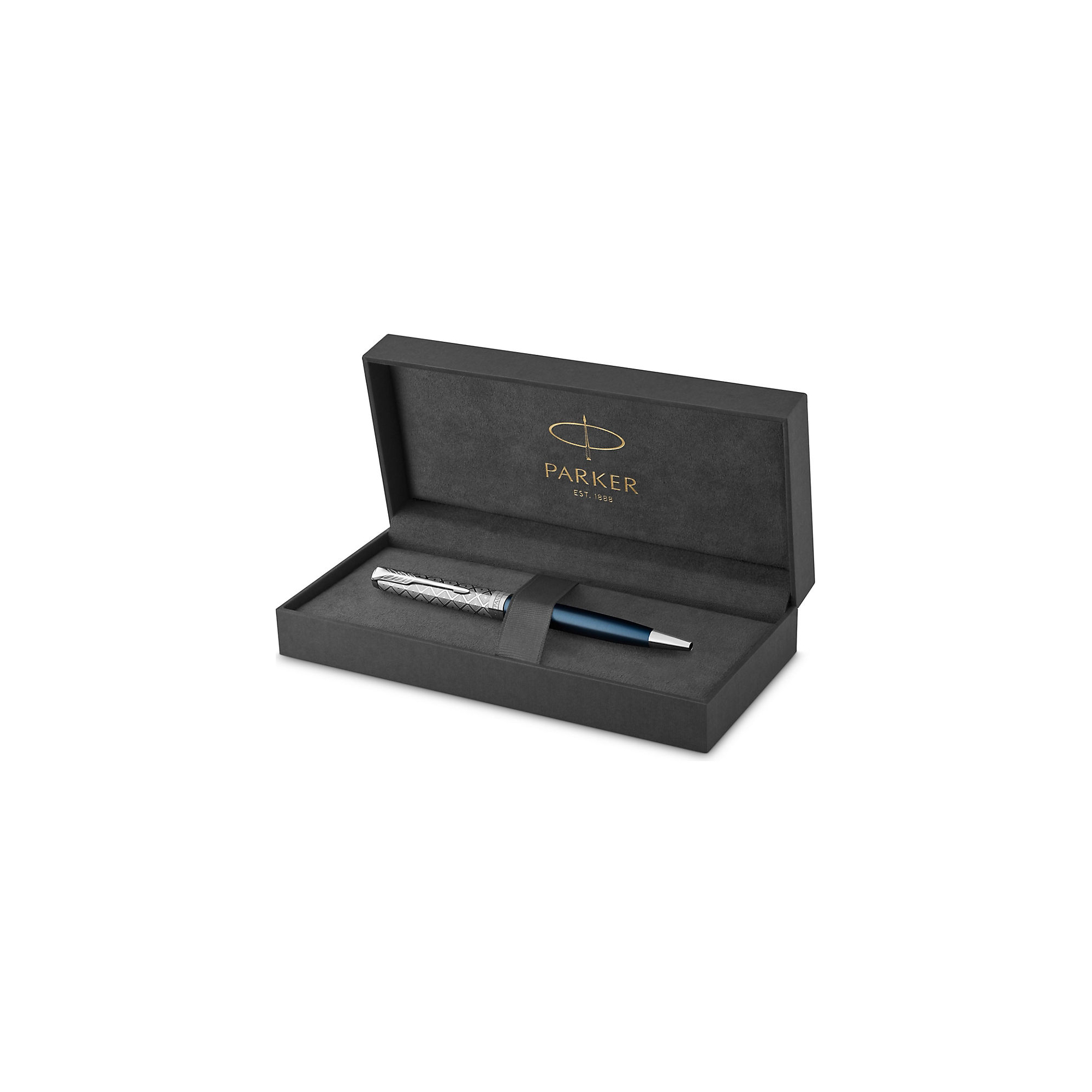 À travers toute une variété de styles, y compris l’indémodable motif ciselé, le souci du détail dont cette gamme fait preuve est le reflet d’une sophistication que vous ressentirez à chaque fois que vous écrirez. Le Sonnet métal et bleu incarne l’expression classique du raffinement et de l’élégance. Orné d’un verni bleu satiné et d’habillages à la finition palladium. Son capuchon en argent met en évidence une gravure évocatrice du diamant qui reflète la sophistication. Acier inoxydable + verni bleu + laser + verni satiné translucide que vous ressentirez à chaque fois que vous écrirez. Technologie Quinkflow® pour une écriture plus fluide, plus propre et plus régulière, en un mot : le meilleur stylo-bille. Parker de tous les temps. Stylo fabriqué dans le centre d'excellence de  Saint-Herblain (44. France).