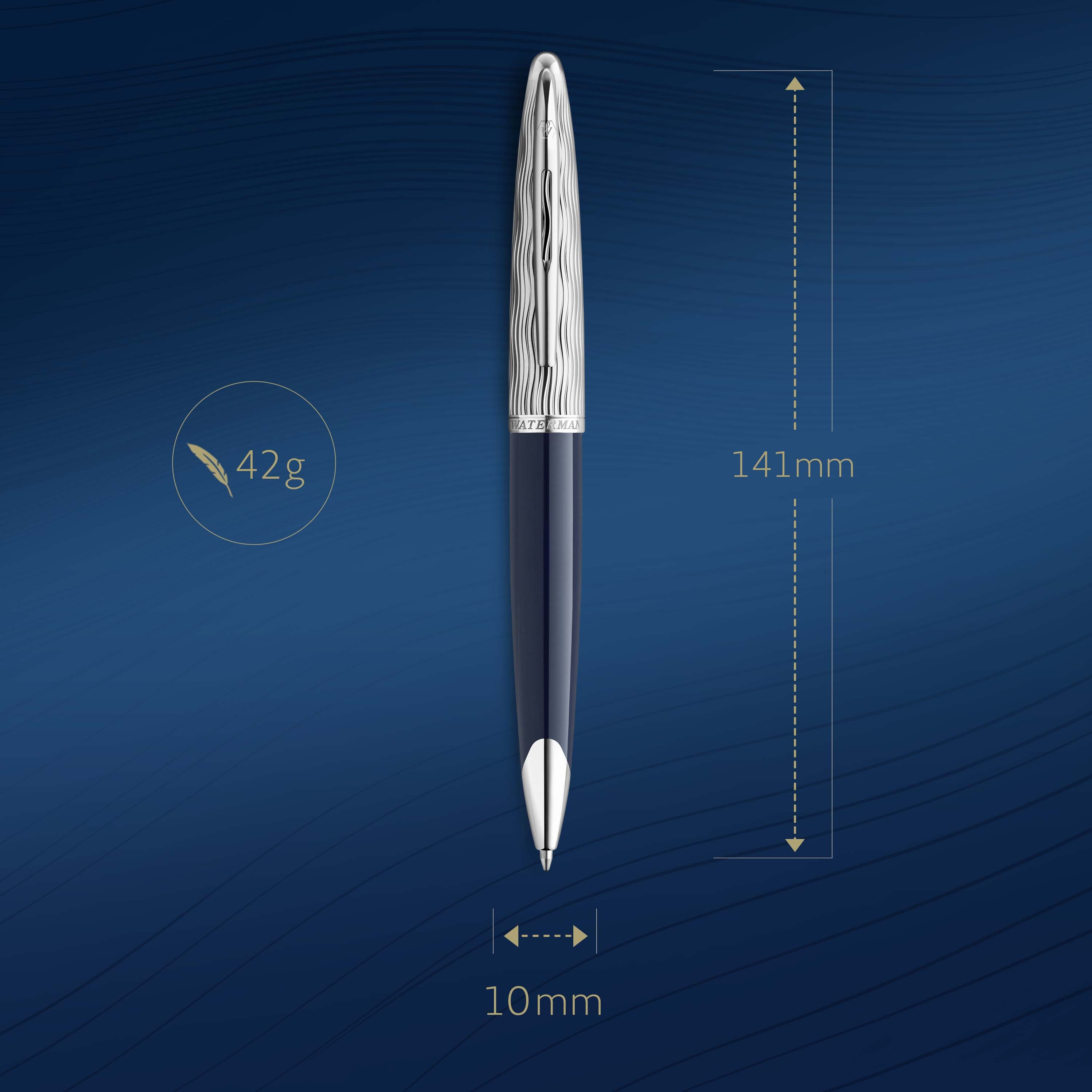 - Waterman emblématique laqué bleu profond sur corps, motif de vague ciselé sur le capuchon et capuchon plaqué palladium pour une finition haut de gamme