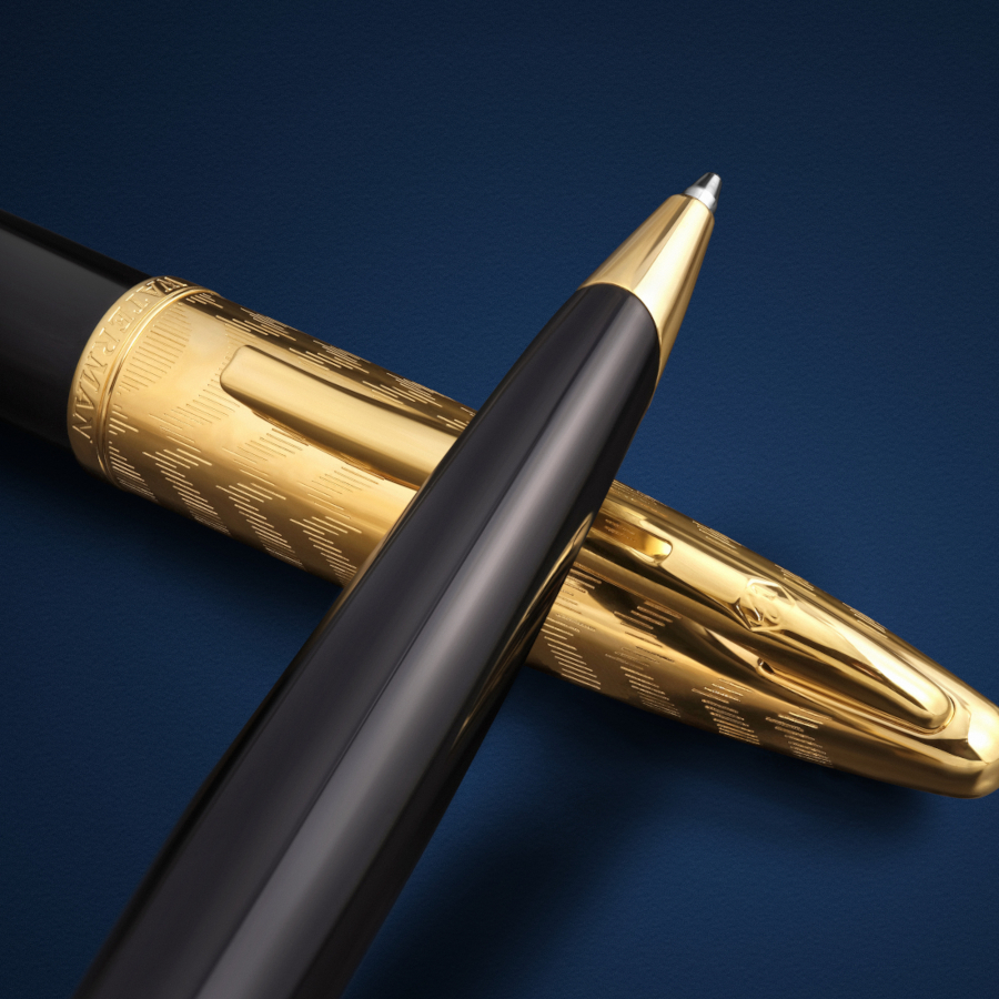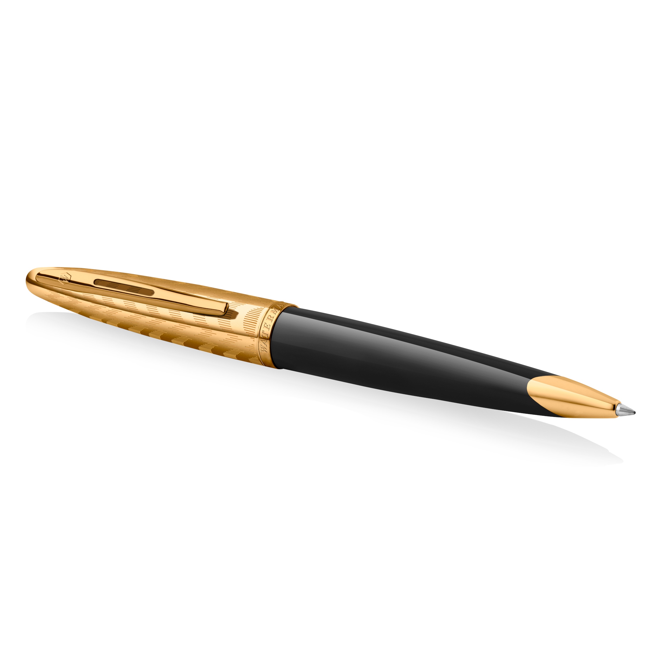 Les lignes arrondies raffinées du Carène et la laque noir intense de son corps s’accordent à la perfection avec ses finitions plaqué or et son capuchon finement travaillé.