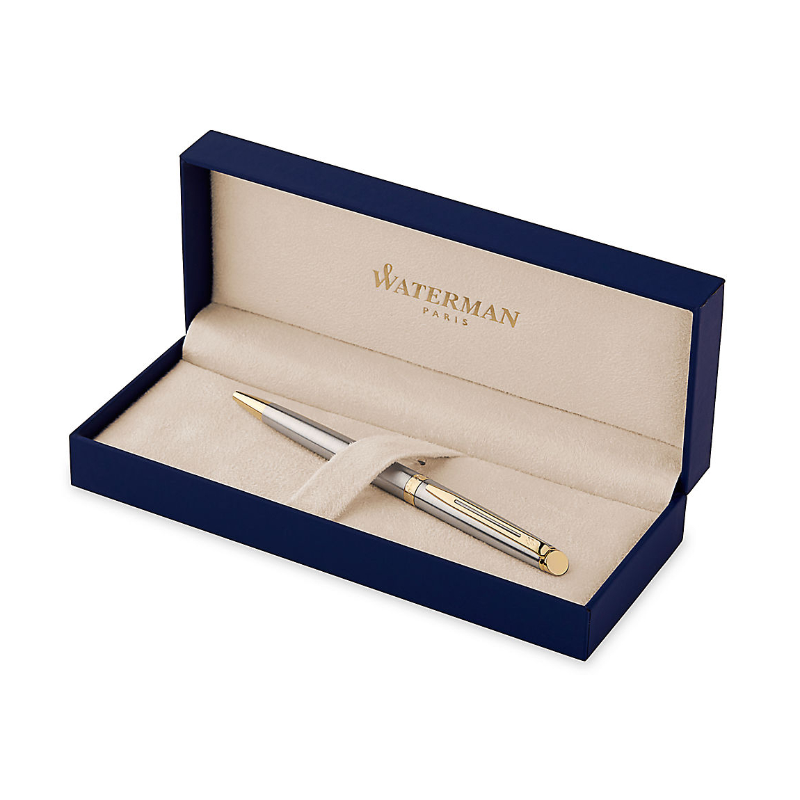 Stylo bille à mécanisme à rotation. Acier. Attributs plaqués or. Livré dans son écrin luxe et avec sa garantie Waterman. Stylo fabriqué en France dans le centre d'excellence de Saint-Herblain (40).