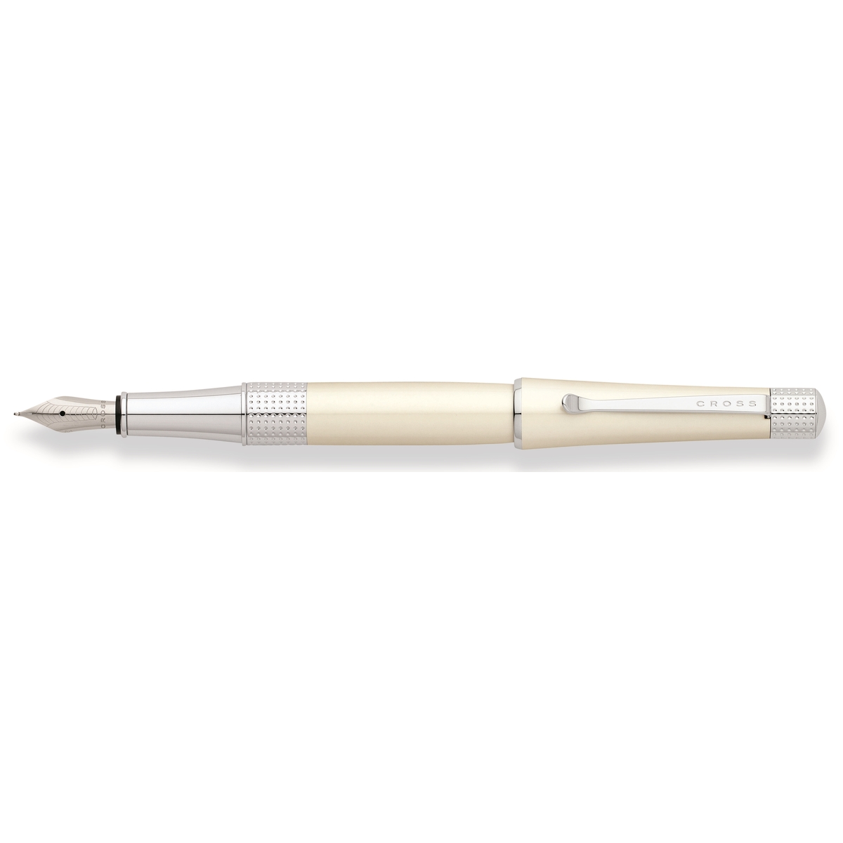 Corps laque blanche nacrée et attributs chromés. plume acier rhodiée de taille moyenne. Garantie à vie. Plume de taille moyenne uniquement.