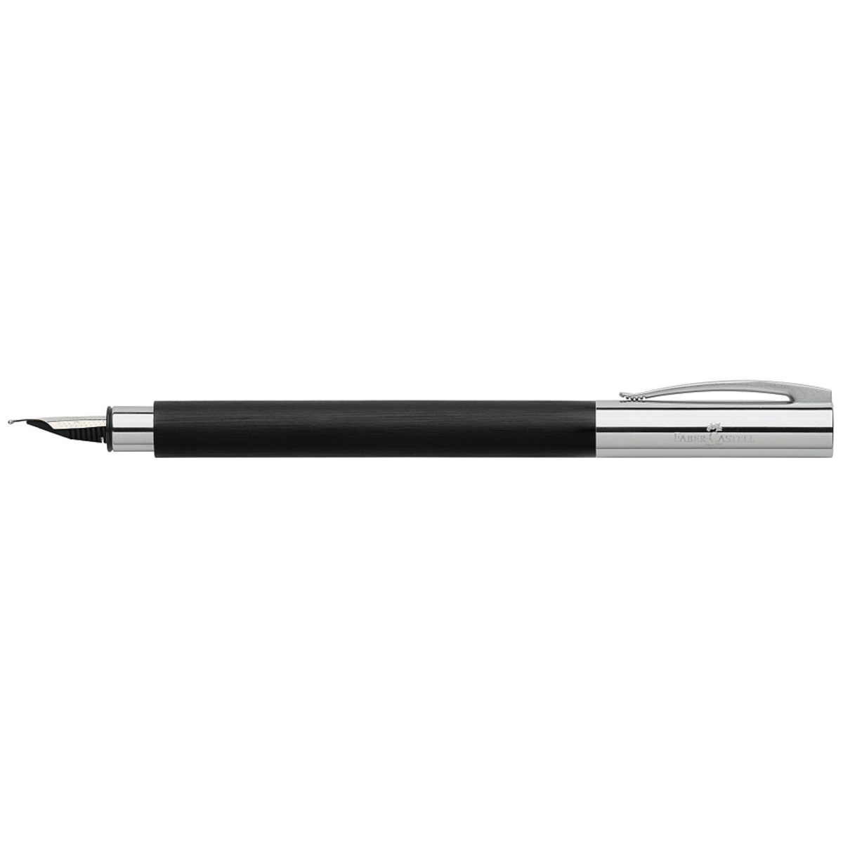 Stylo plume à cartouches. Corps en résine noire. Attributs chromés. Plume acier . Clip à ressort. Livré dans son écrin luxe et avec la garantie Faber-Castell.