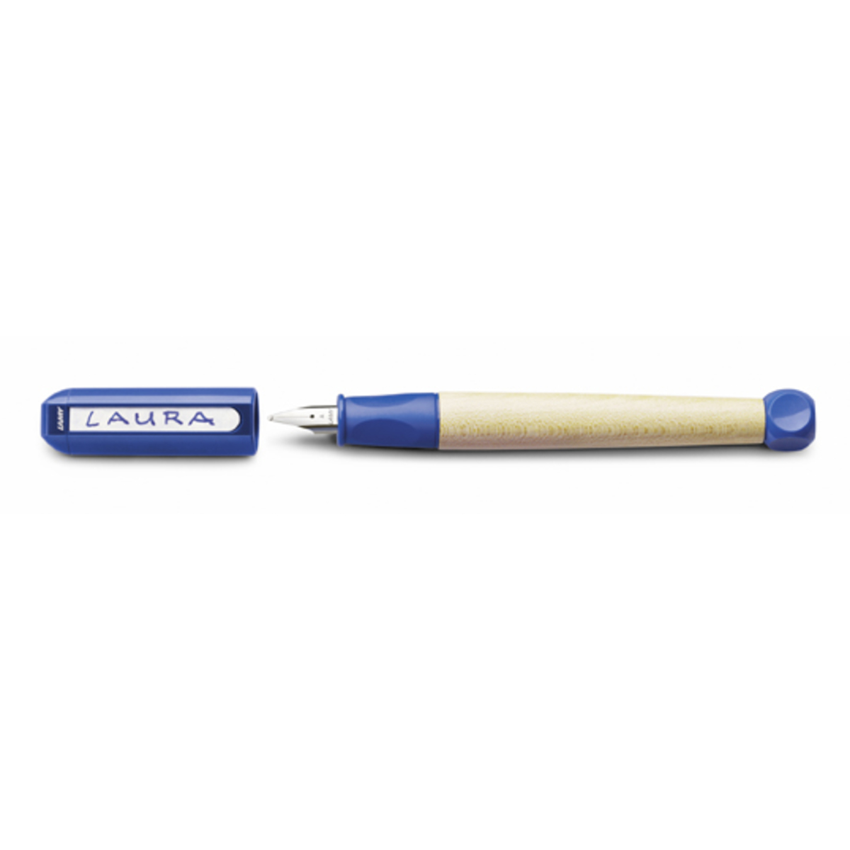 Bois d’érable / capuchon en matière plastique, grip en gomme antidérapante bleu / plume en acier poli / cartouche d’encre T 10 bleue / utilisable aussi avec convertisseur Z 24.