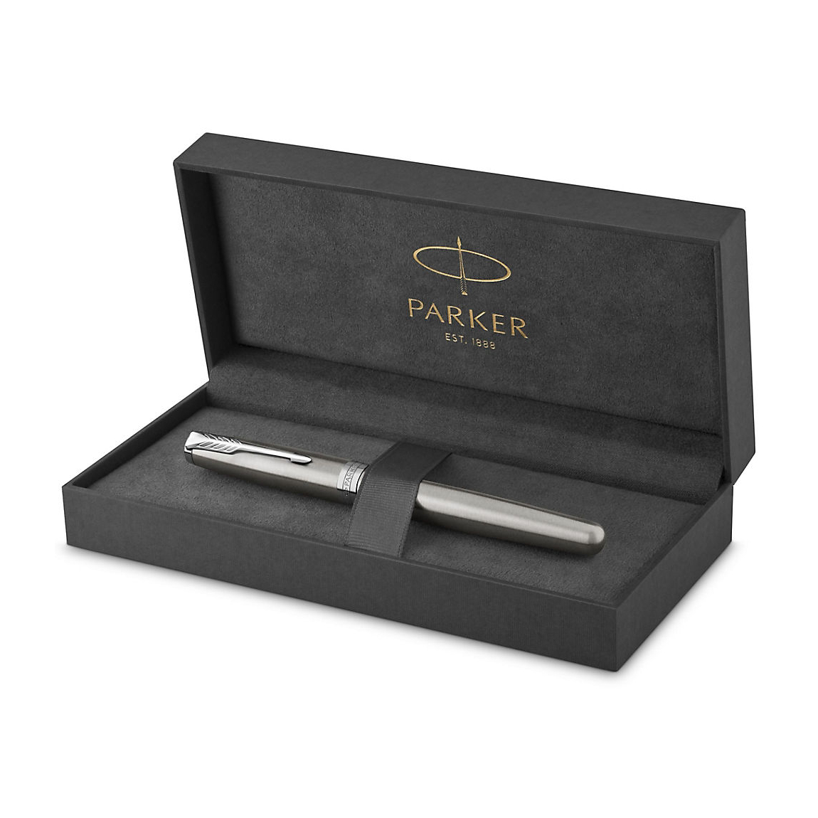 Stylo-plume Sonnet Acier. •Symbole intemporel de l'élégance Parker. •Corps et capuchon en acier brossé inoxydable. •Plume en acier inoxydable. •Agrafe en forme de flèche et attributs finition palladium. •Taille de la plume : fine ou moyenne. •Livré avec cartouche d'encre noire. •Présenté dans son élégant étui Parker. Stylo fabriqué dans le centre d'excellence de Saint-Herblain (44).
