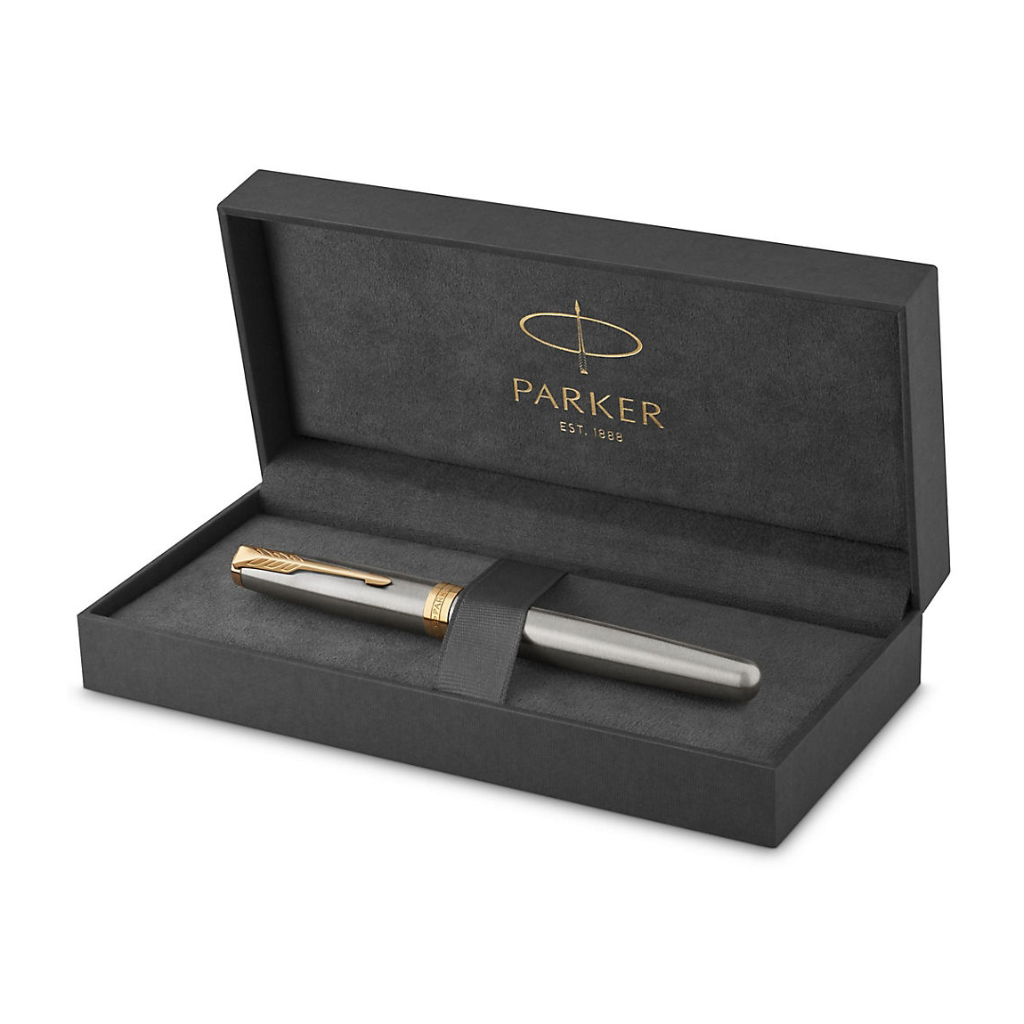 Stylo-plume Sonnet Acier. •Symbole intemporel de l'élégance Parker. •Corps et capuchon en acier brossé inoxydable. •Plume en acier inoxydable finition or. •Agrafe en forme de flèche et attributs finition or. •Taille de la plume : moyenne ou fine. •Livré avec cartouche d'encre noire. •Présenté dans son élégant étui Parker. Stylo fabriqué en France dans le centre d'excellence de Saint-Herblain.