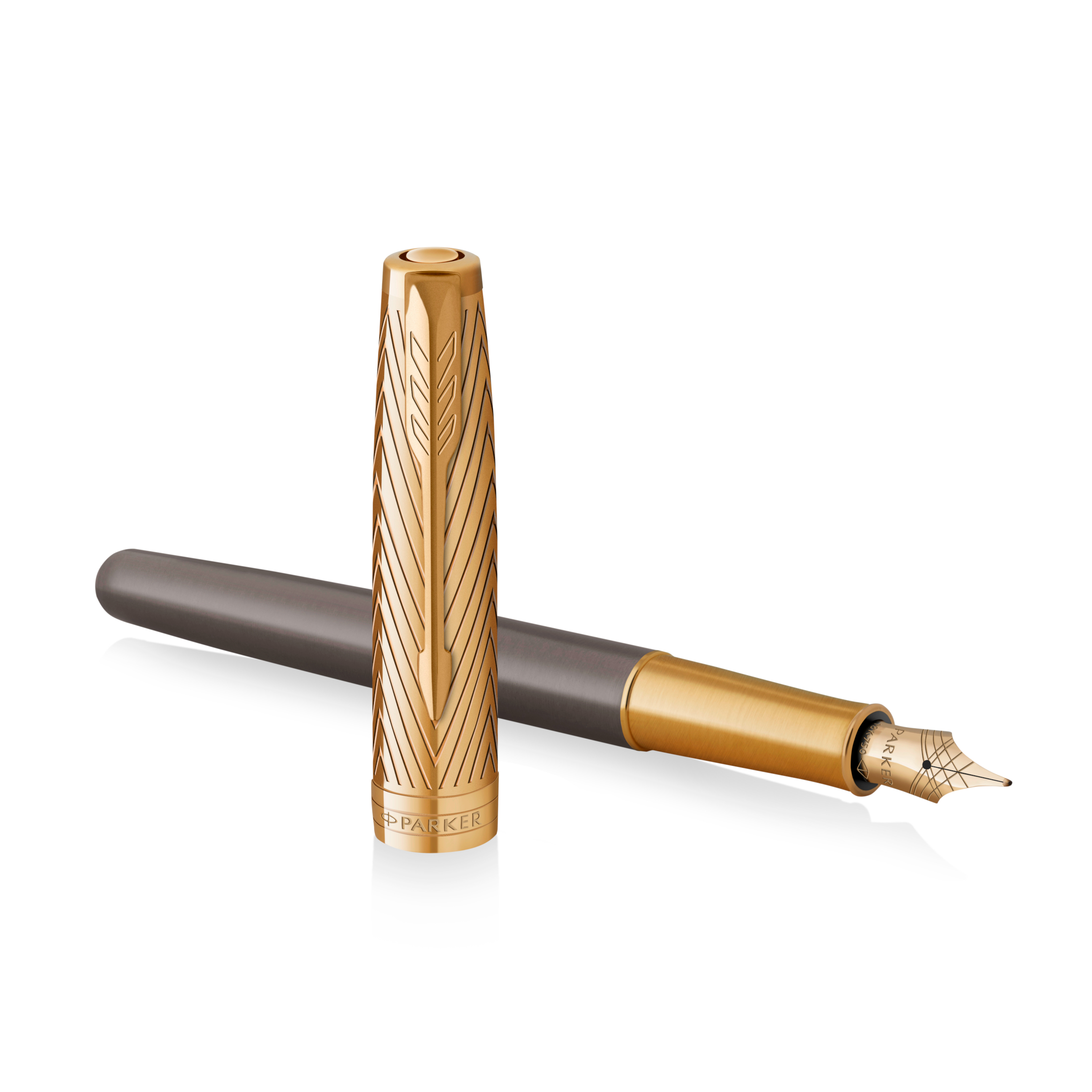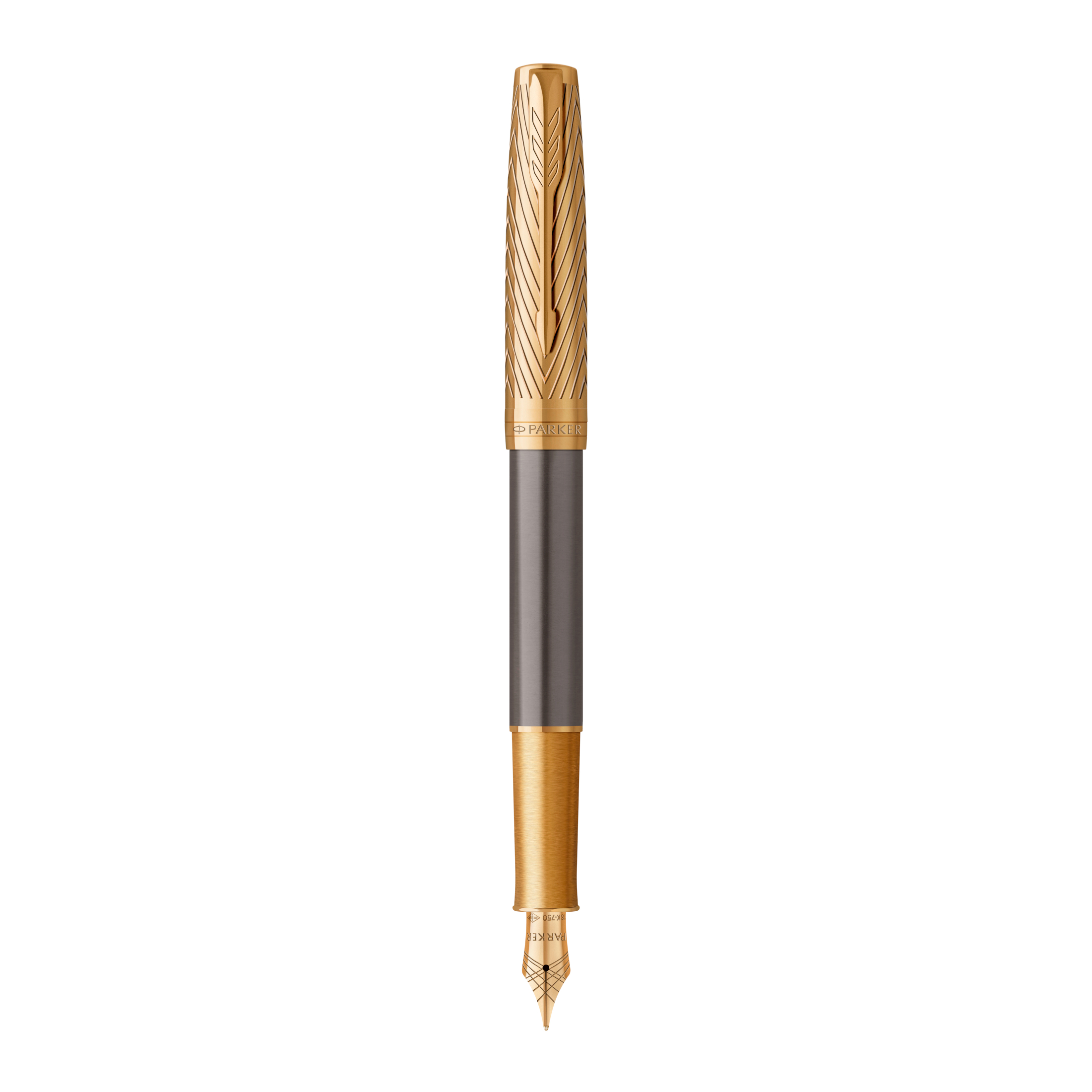 Stylo plume Parker Sonnet Collection Parker Pioneers, Laque grise avec capuchon et finitions or, Plume fine en or massif, Encre noire et convertisseur. Ancré dans les valeurs Parker, le capuchon délicatement gravé du Parker Pioneers fait écho à la fameuse flèche orientée vers le haut, symbole de l’état d’esprit avant-gardiste de George Parker et de son attitude de pionnier. Finition or 23 carats. Il se compose d’une plume en or massif 18 carats ainsi que d’un capuchon et de finitions en or plaqué 23 carats, le tout complété par un corps gris laqué. Assemblé à la main et qualité contrôlée sans défauts. Rechargeable avec un convertisseur et compatible avec les cartouches et les flacons d’encre Parker. Ce modèle Parker Sonnet est présenté dans un prestigieux coffret cadeau Parker, avec un manchon rehaussé du fameux motif chevron. Outre le Sonnet, le coffret comprend également deux cartouches longues d’encre noire et le livret de garantie.