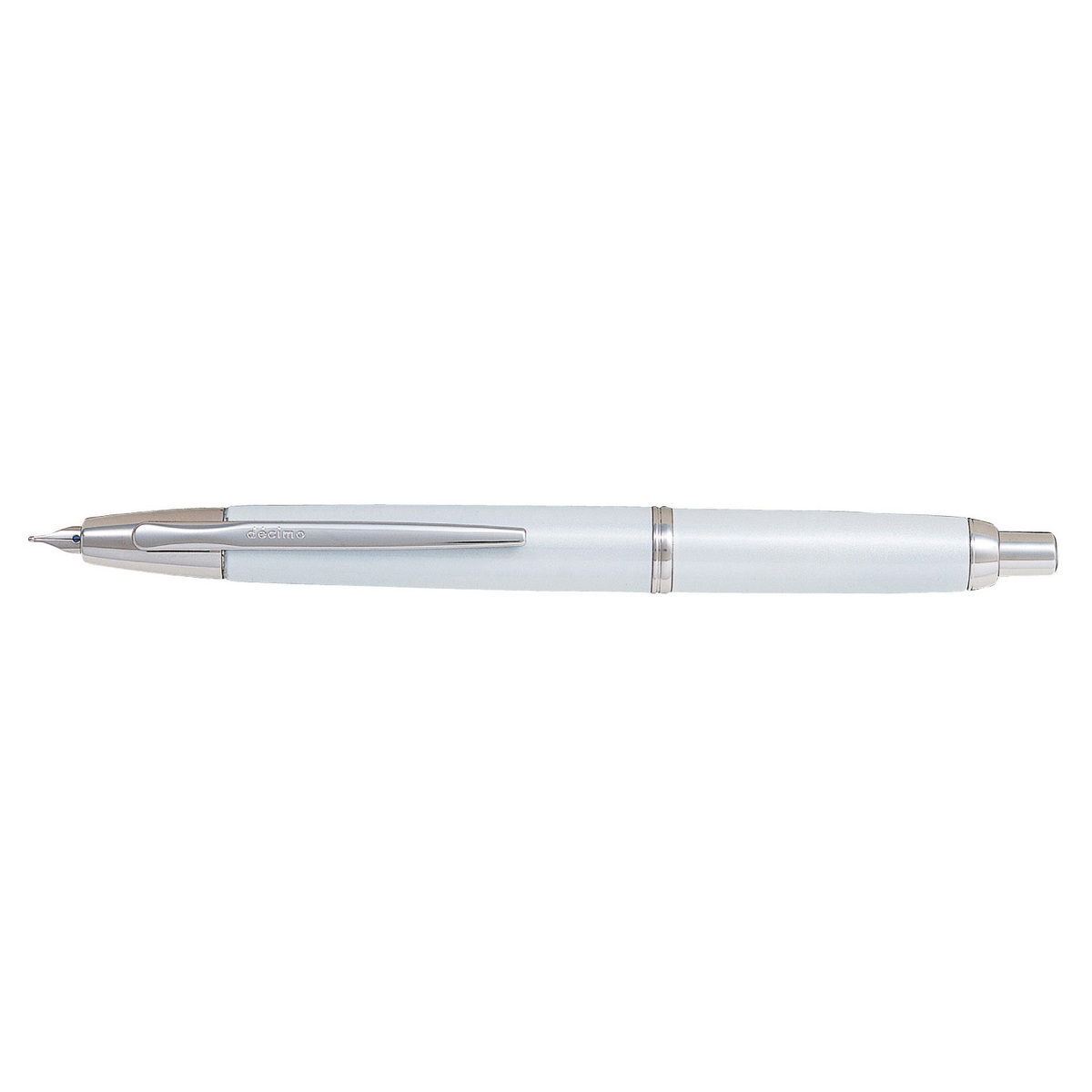 Stylo plume à cartouches avec système de rétractation de la plume. Modèle fin, plus féminin. Blanc métal.