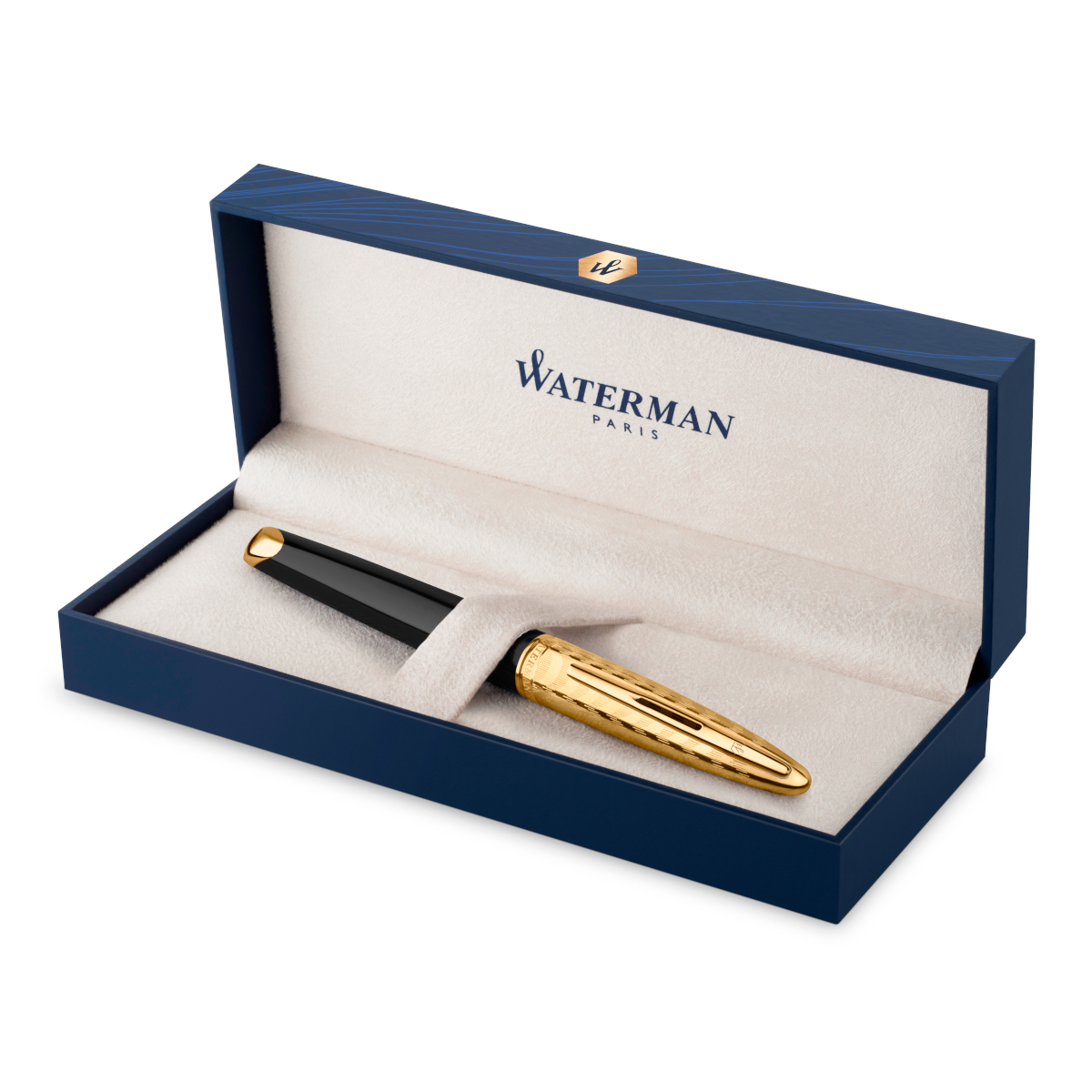 Les lignes arrondies raffinées du Carène et la laque noir intense de son corps s’accordent à la perfection avec ses finitions plaqué or et son capuchon finement travaillé.