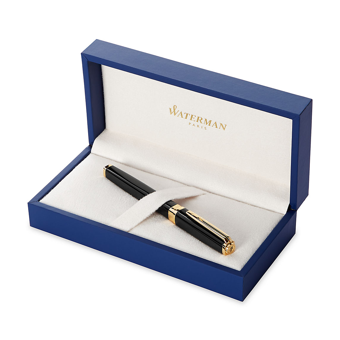 Stylo plume à cartouches. Laque noire. Plume or 18 carats. Le premier accessoire d'écriture quadrangulaire laqué. Attributs plaqués or. Un système de fermeture à baïonnette innovant pour un alignement parfait entre le corps et le capuchon. Livré dans son écrin luxe et avec sa garantie Waterman. Fabriqué en France dans le centre d'excellence de Saint-Herblain (44); 130 ans de savoir-faire et d'expertise.