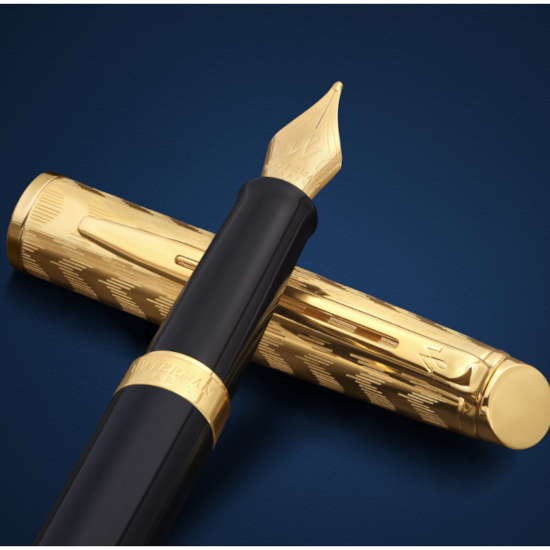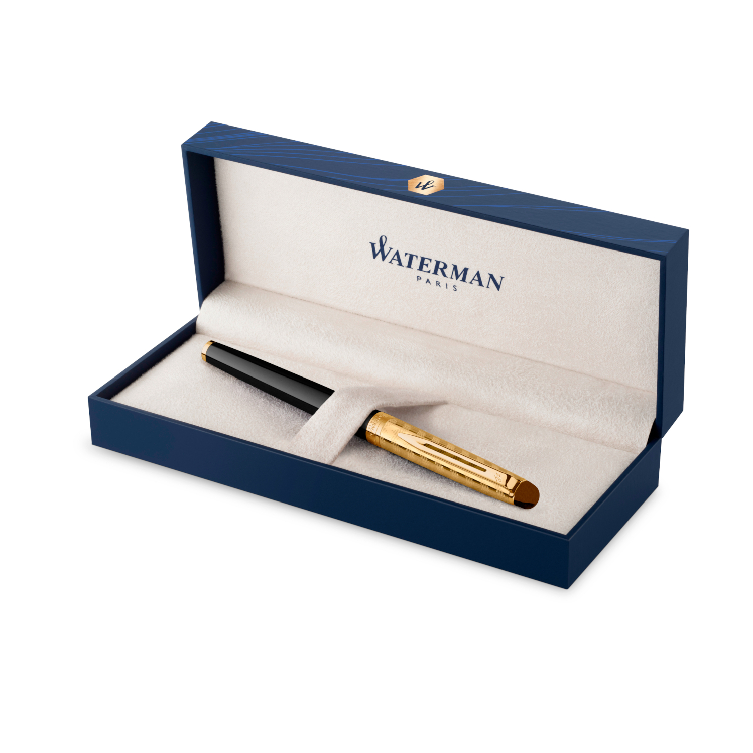 - L’emblème W à boucle Waterman classique ornant la plume en acier inoxydable plaqué or vient sublimer l’élégance sophistiquée du stylo plume.