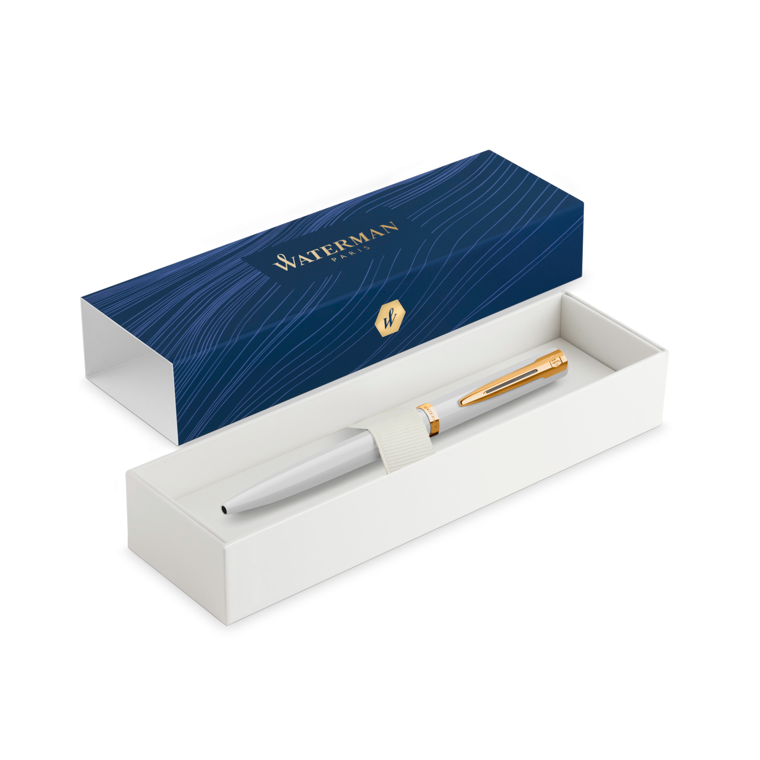 - Une silhouette élégante dotée d’un corps et d’un capuchon rehaussés d’une finition laquée blanche brillante. Le clip Waterman emblématique à double branche et un large anneau plaqué or sur le capuchon confèrent une distinction raffinée à ce magnifique instrument d’écriture.