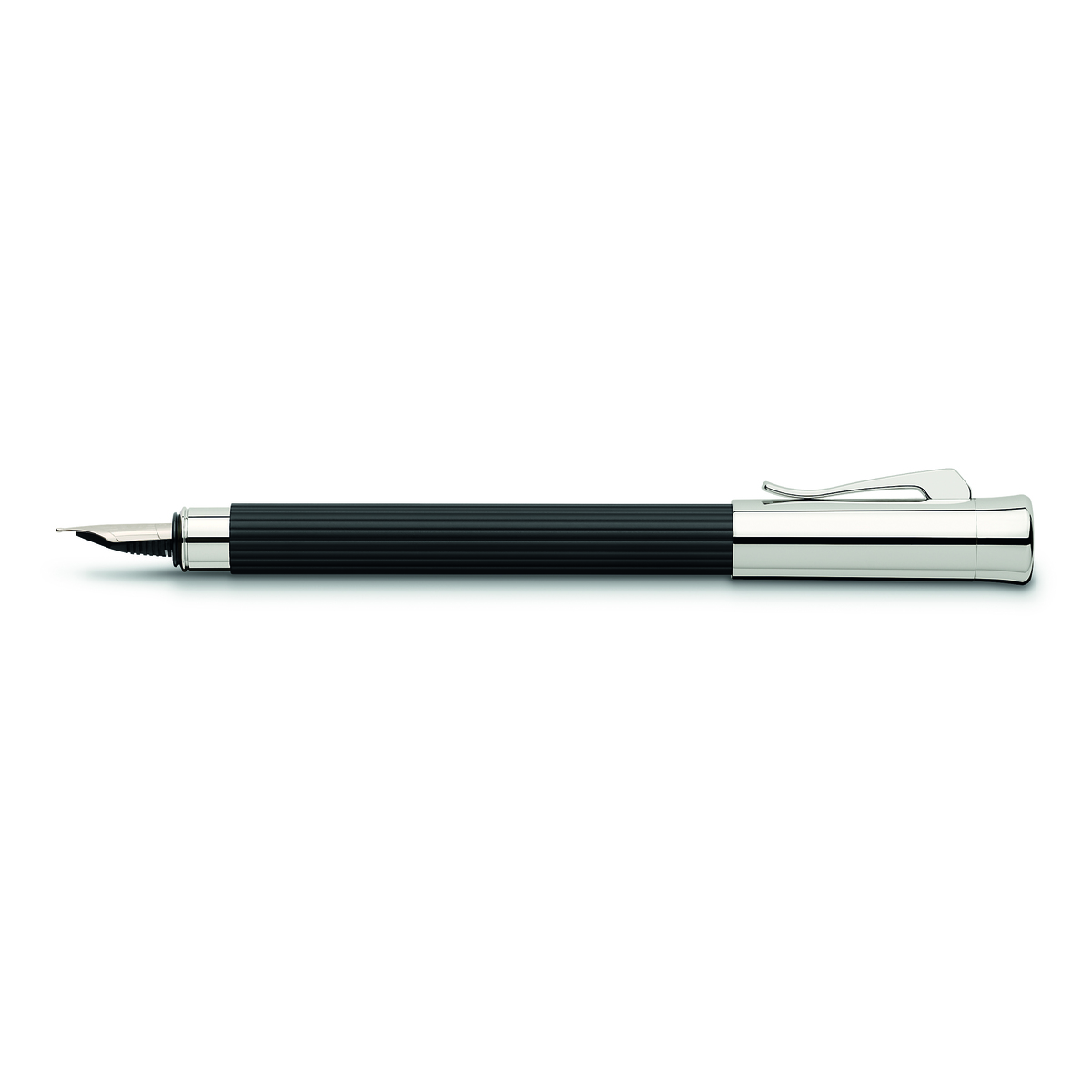 Stylo plume avec corps métal (laiton) laqué mat, attributs métal chromé poli brillant. Plume acier inoxydable, plaquée rhodium et logo Graf von Faber-Castell.