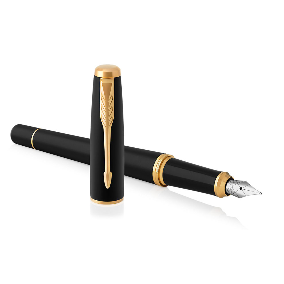 • Fini laqué noir assourdi au toucher poudreux, finitions dorées et la signature PARKER de l’agrafe en forme de flèche