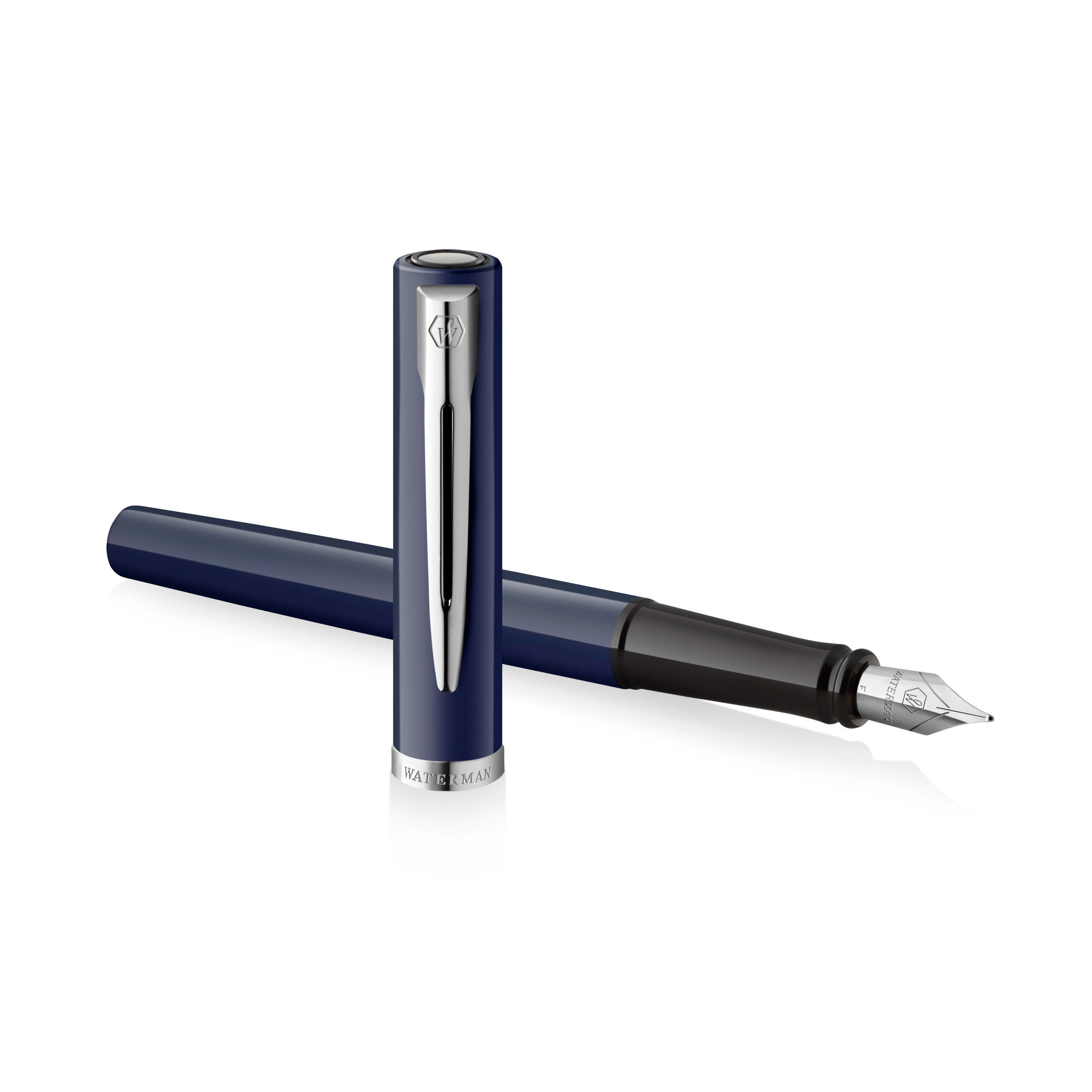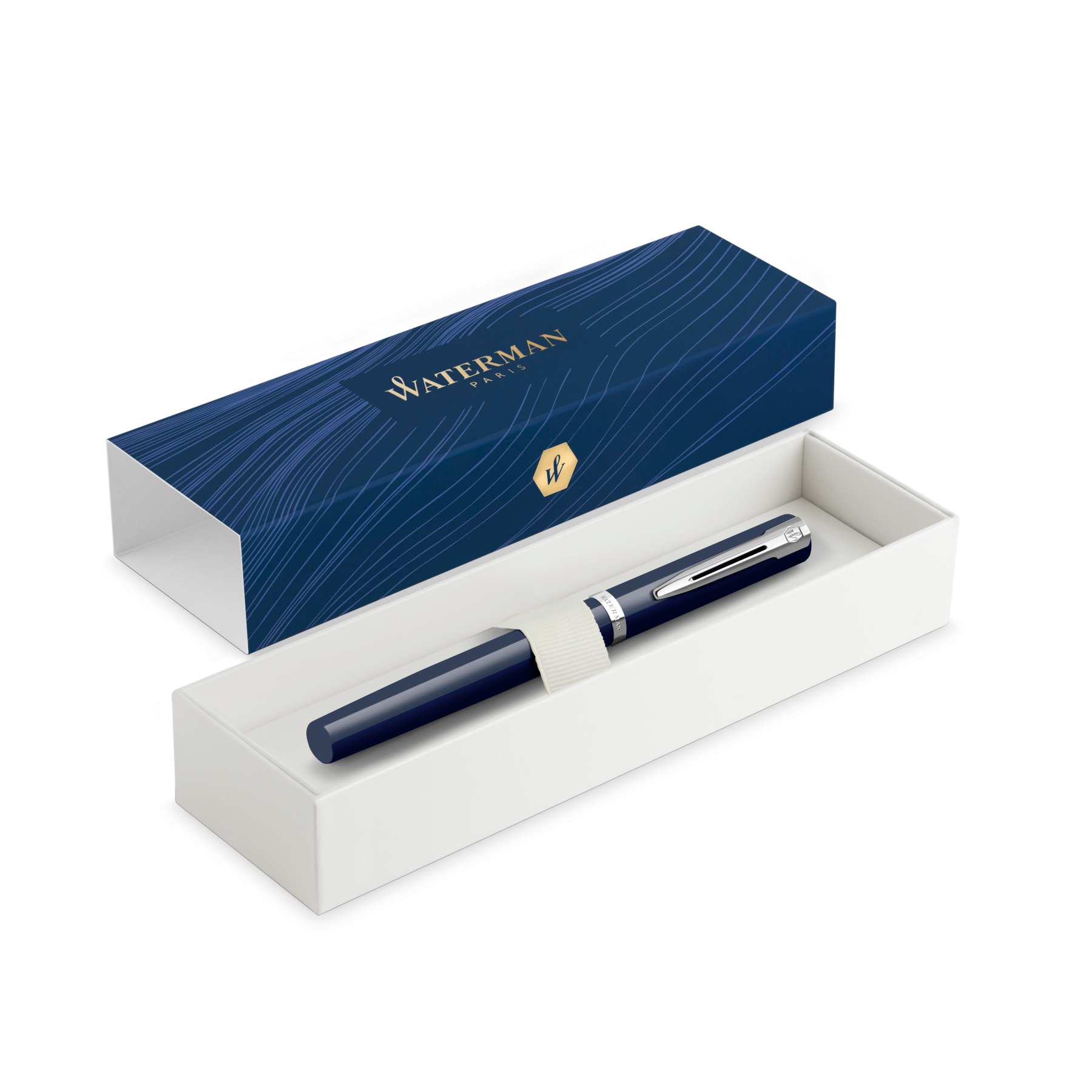 • Une silhouette élégante dotée d’un corps et d’un capuchon rehaussés d’une finition laquée bleue brillante. Le clip Waterman emblématique à double branche et un large anneau plaqué palladium sur le capuchon confèrent une distinction raffinée à ce magnifique instrument d’écriture.
